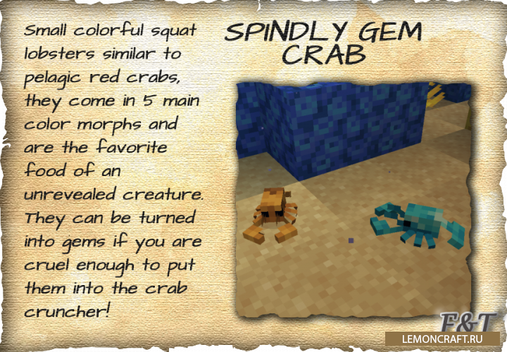Мод на прикольных мобов Fins and Tails разнообразит игру различными интересными мобами, среди которых можно будет встретить и обычных рыбок и странных крабов. В мод уже добавлено более 30 новых существ и по заверению автором мода это еще не конец.